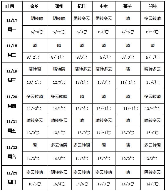 本周(11 月 17 日 - 23 日),金鄉(xiāng)、邳州、杞縣、中牟、萊蕪、蘭陵等產(chǎn)區(qū),天氣將以晴好或多云為主。周內(nèi)受寒潮影響,產(chǎn)區(qū)氣溫較上周大幅下降,局部地區(qū)降溫幅度達(dá) 10℃左右。11 月 17 日 - 18 日,寒意顯著。19 日之后,氣溫整體呈回升趨勢,多地最高氣溫從月初的 5 - 9℃升至周末的 14 - 17℃,最低氣溫也從零下回升至 0 - 8℃。全周無降水。