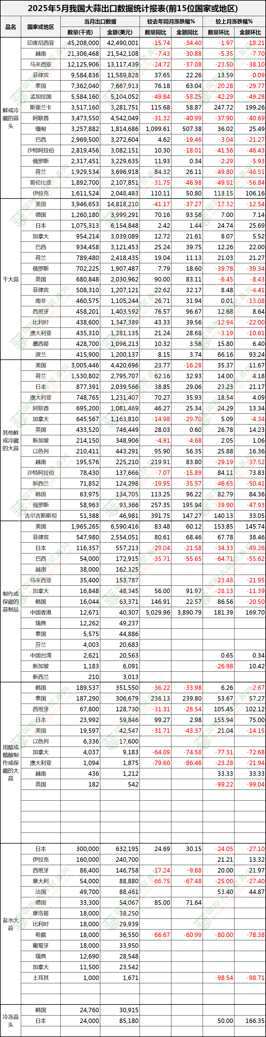 2025年5月大蒜出口數(shù)據(jù)(按國家)