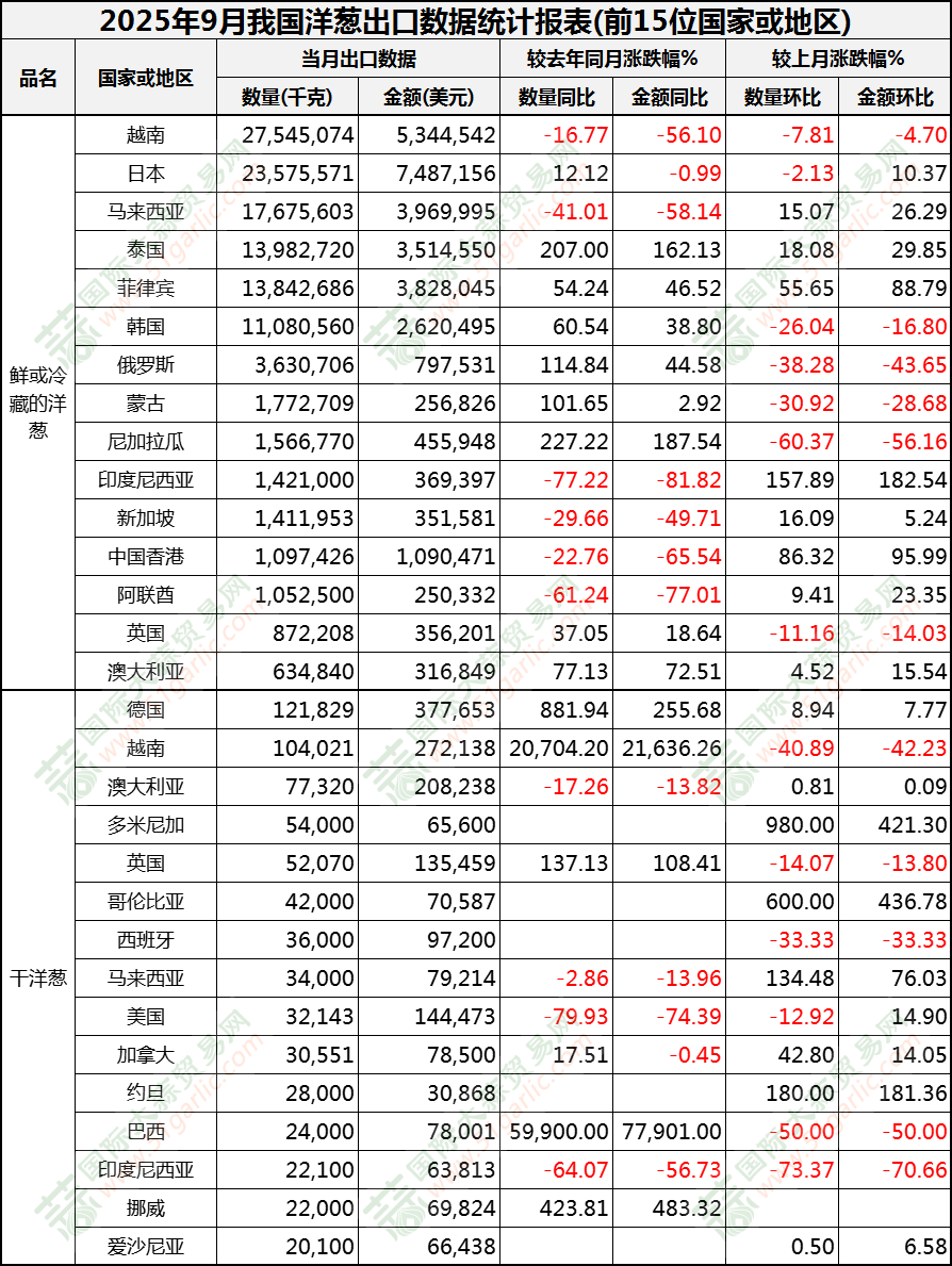 2025年9月洋蔥出口數(shù)據(jù)(按國(guó)家)