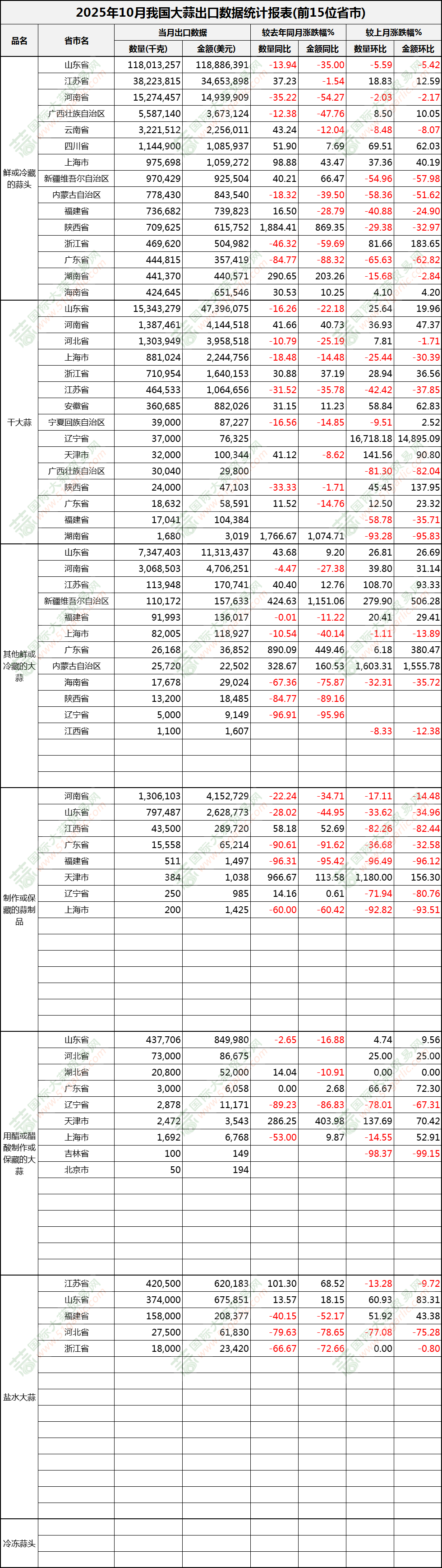 2025年10月大蒜出口數(shù)據(jù)(按省市)