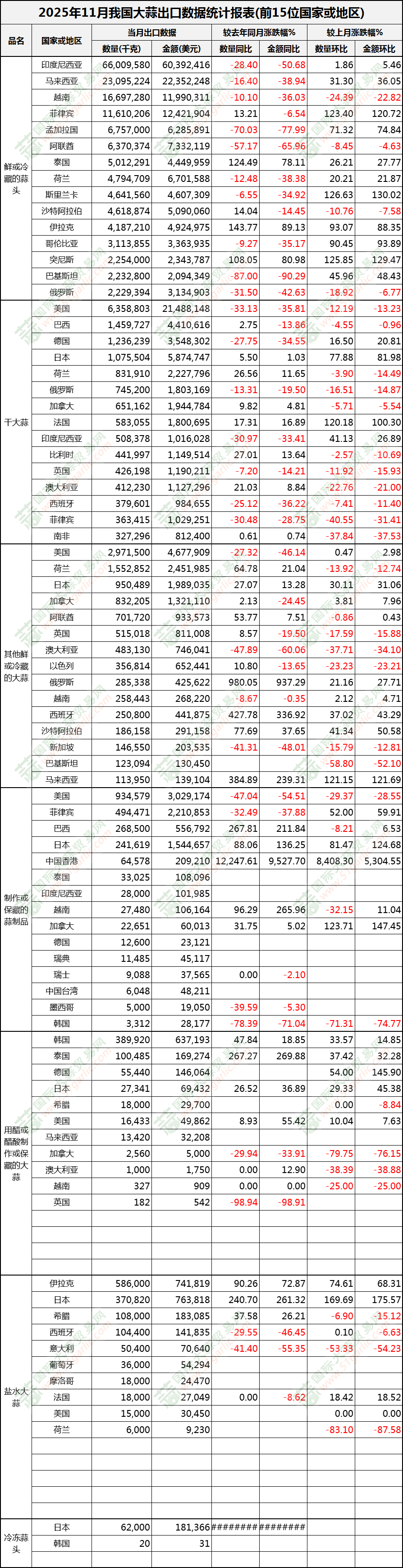 2025年11月大蒜出口數(shù)據(jù)(按國(guó)家)