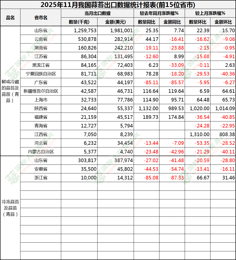 2025年11月蒜苔出口數(shù)據(jù)(按省市)