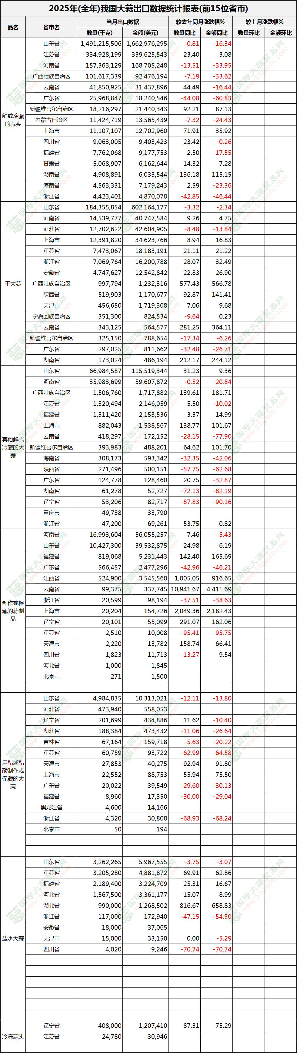 2025年全年大蒜出口數(shù)據(jù)(按省市)