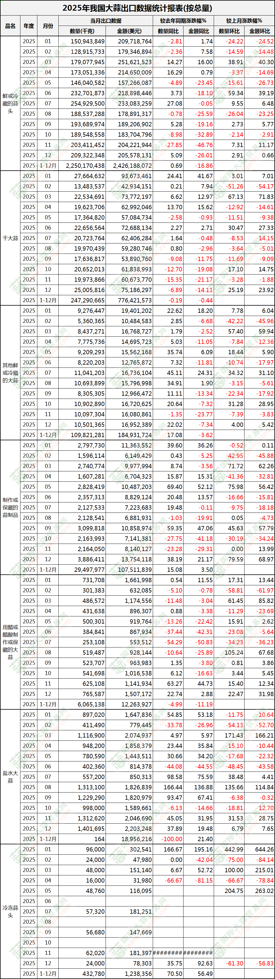 2025年12月大蒜出口數(shù)據(jù)(按總量)