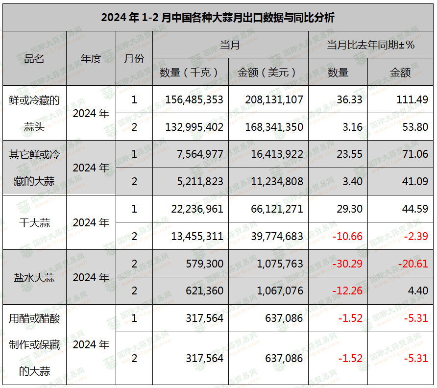 2024年1-2月大蒜出口同比上漲